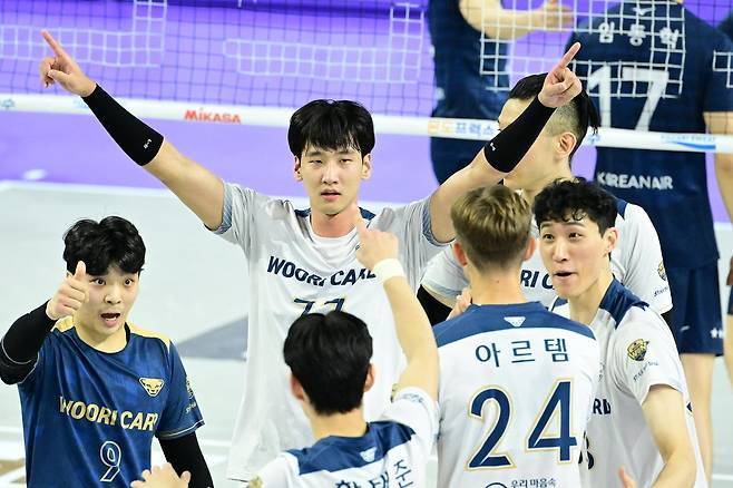 Woori Card defeated Korean Air with a set score of 3-0 (25-21 27-25 25-23) and obtained the magic number to secure first place in the regular league.